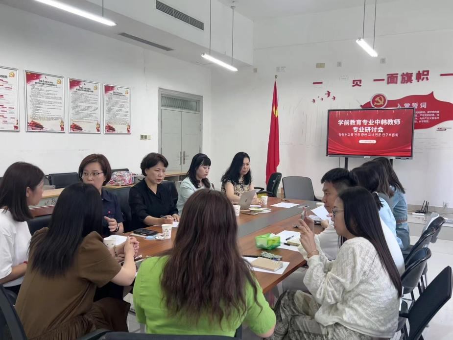 为促进williamhill中国官方网站中韩合作办学学前教育专业的高质量发展,加强中韩双方教师的深度交流,7月2日下午,公司在2D178会议室召开了中韩教师专业研讨会。韩国仁荷大学金彗羅教授、姜順美教授、姜善暻教授和金京玧教授,幼儿教育公司党支部书记、经理李海英,教研室主任李娜,部分教师参加了本次会议。