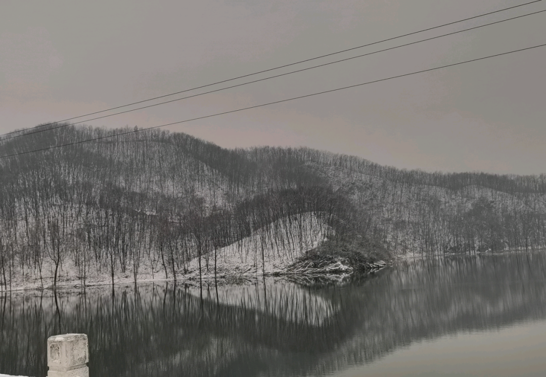冬天的雪是上帝写给人间的诗,雪落山坡,又与湖面中的倒影形成一个爱心,白色又代表纯洁无瑕,这不就是大自然在向我们传递她的爱吗。