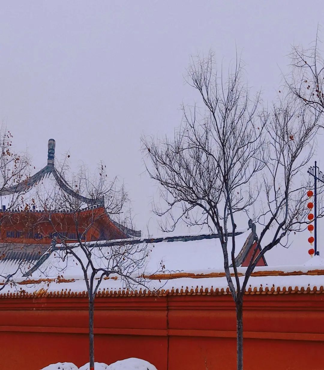 “黄琉璃瓦落白雪,回眸已是越千年”。琉璃碧瓦,红墙白雪。墙外的枝丫在落雪映衬下,展现出“忽如一夜春风来,千树万树梨花开”之景。