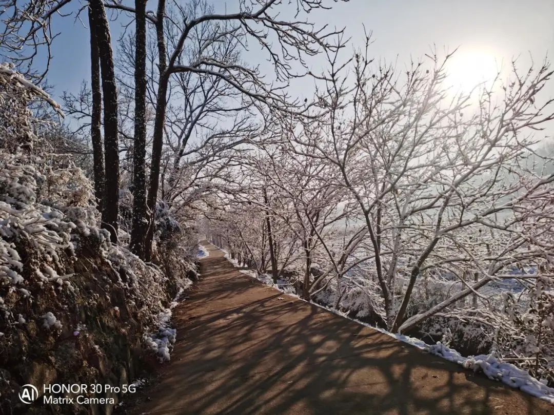 雪后初晴,小路绵延,一眼竟望不到尽头。枝头上空的太阳,也如灯塔一般,照耀着大地,暗示着春暖花开的日子不远了。