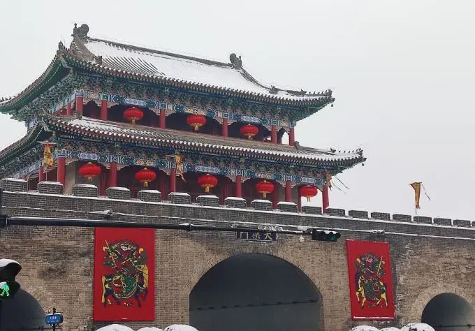 大梁门用青砖造构,雕梁彩绘,古典质朴,雄伟壮观。大雪静谧,恍惚间梦回东京汴梁。