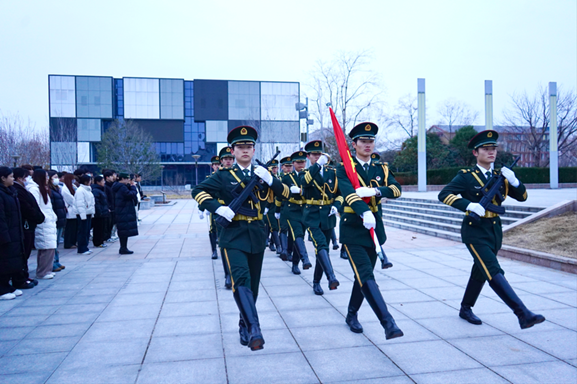 清晨7时40分,国旗护卫队迈着铿锵步伐护送国旗走向旗杆。伴随着《义勇军进行曲》的激昂旋律,五星红旗冉冉升起。全体师生庄严肃立,行注目礼并高唱国歌,爱国的赤诚与守护和平的责任信念在全体师生心中升腾。