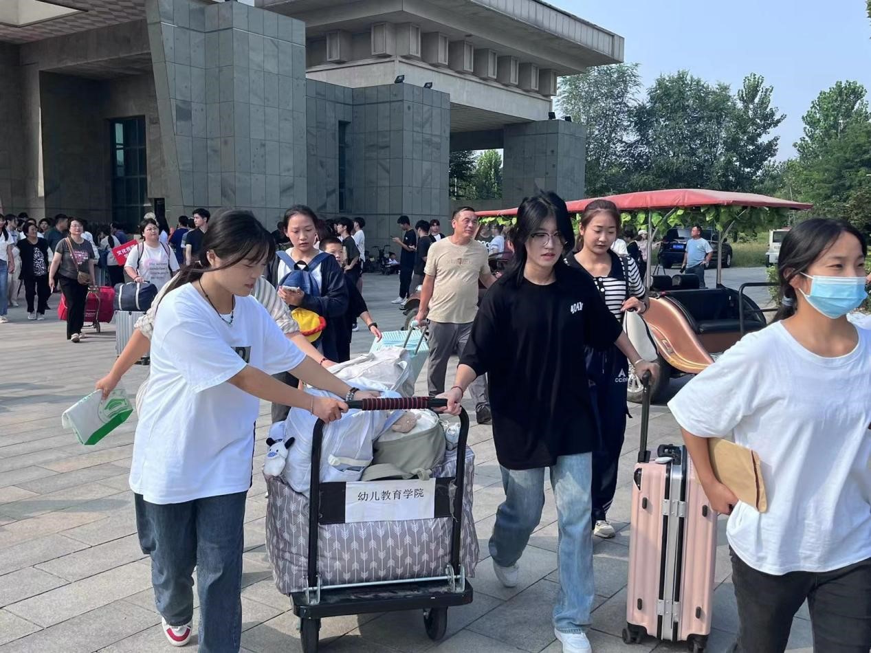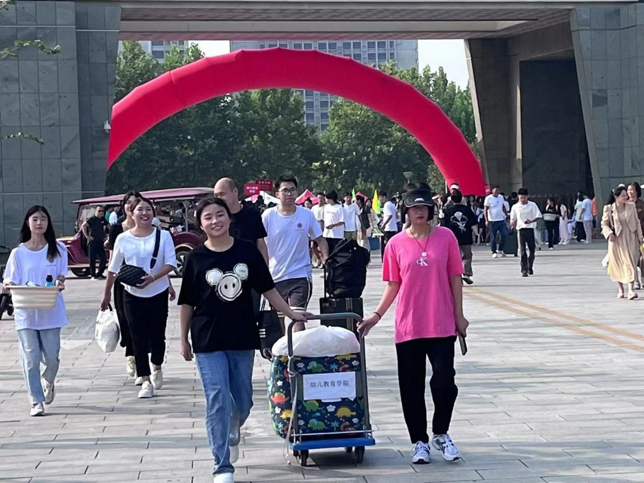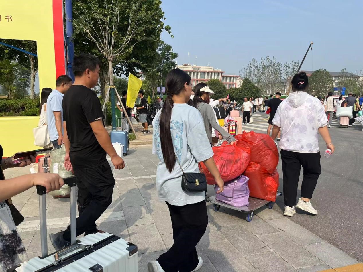 校园里,一位位送孩子的家长,跟随志愿者提着行李将孩子送到宿舍楼下