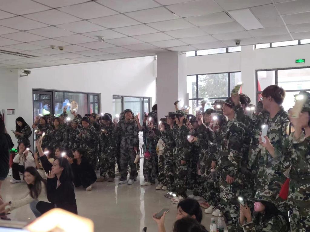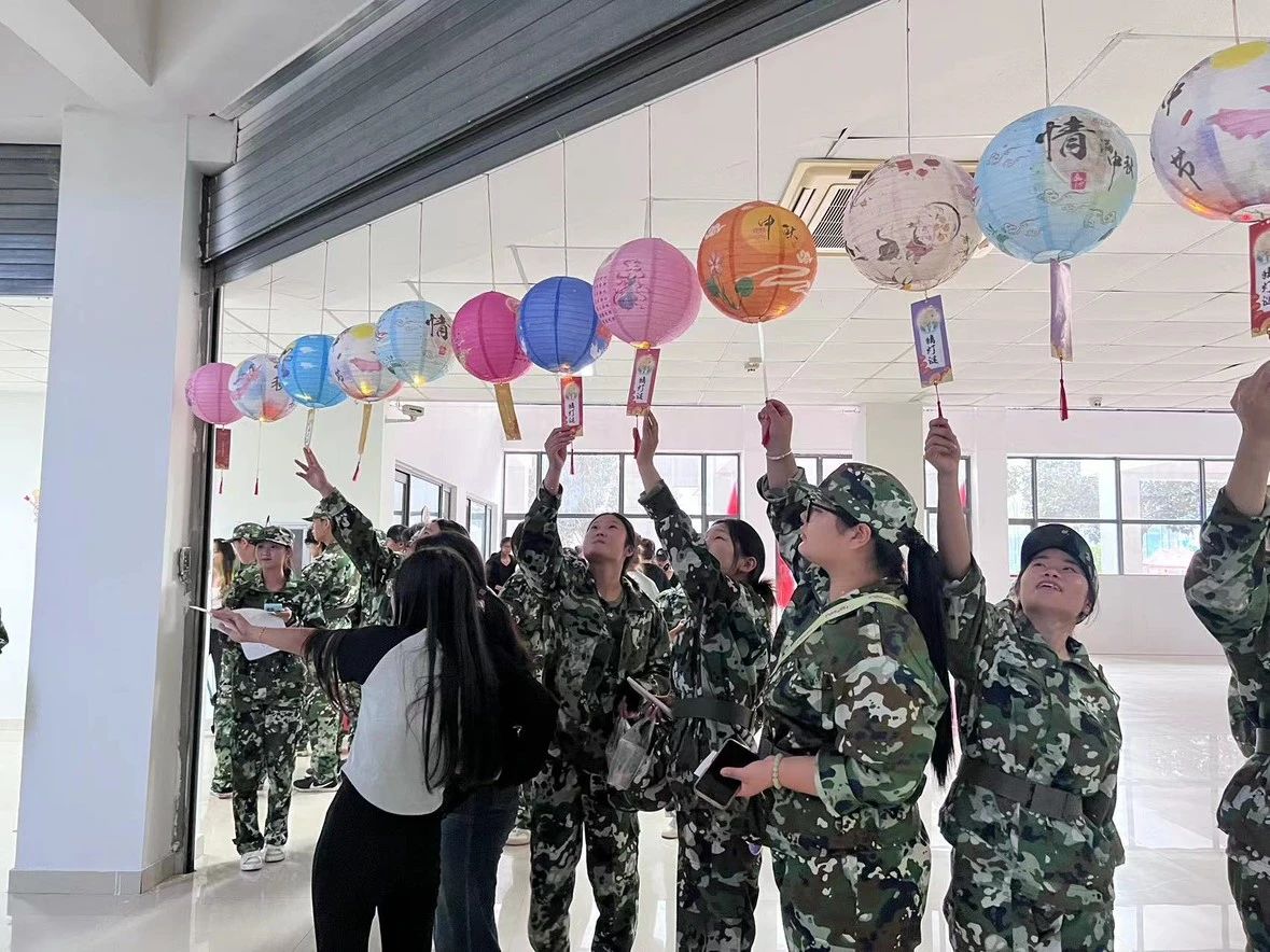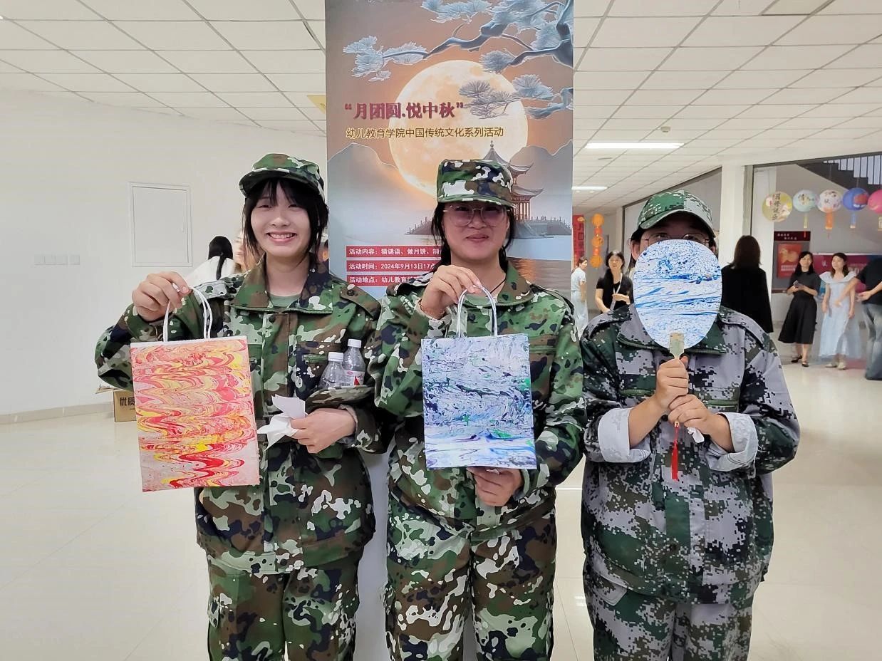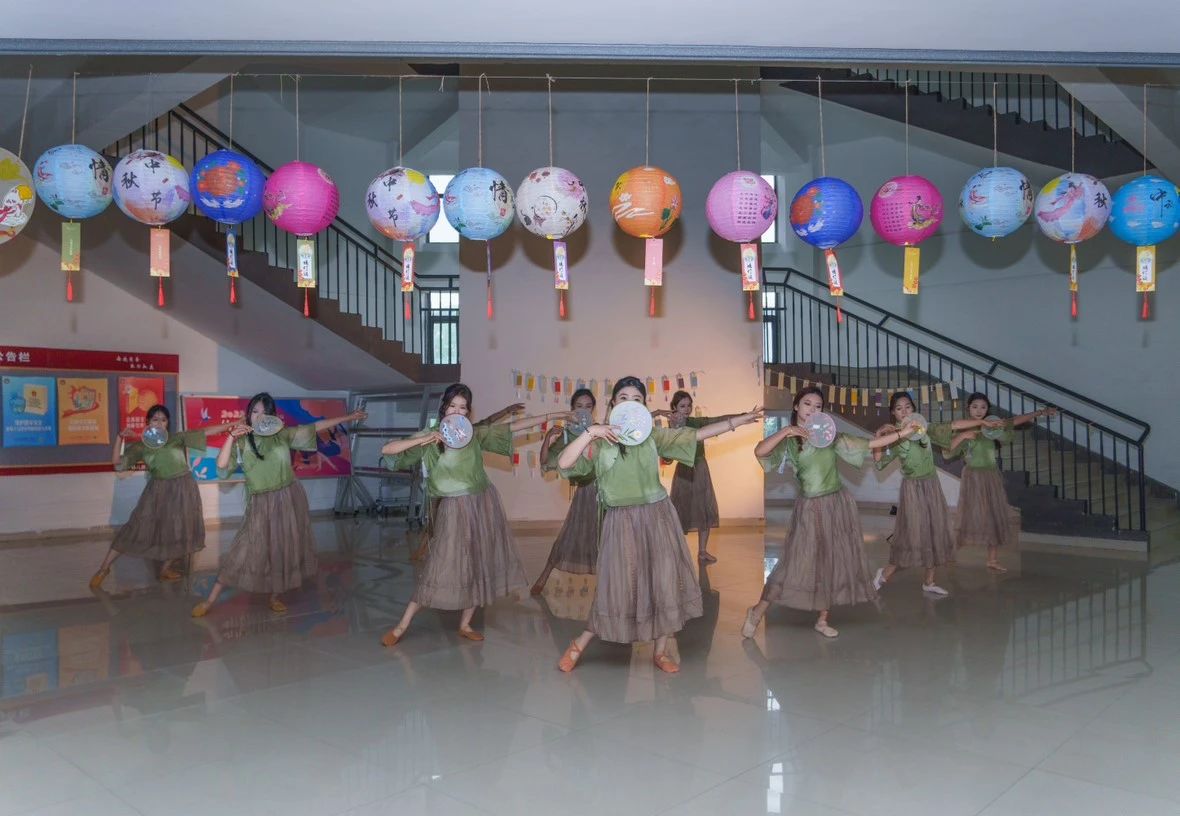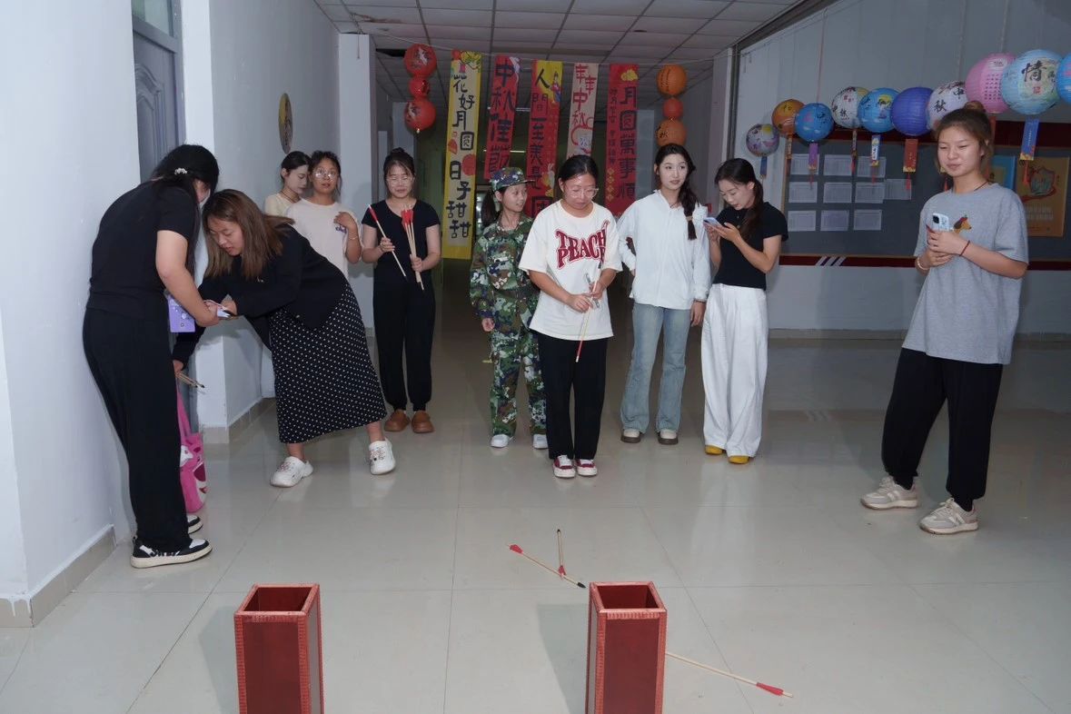 活动开始之前,2023级的同学们表演了传统的汉服舞蹈和诗歌朗诵,幼儿教育公司党支部副书记丁鼎和2023级员工申书任共同演唱了《我们一起看月亮爬上来》,现场欢呼声不断。本次活动分为投壶区、射箭区、冰皮月饼区、猜灯谜区、漆扇制作区、领取奖品区。